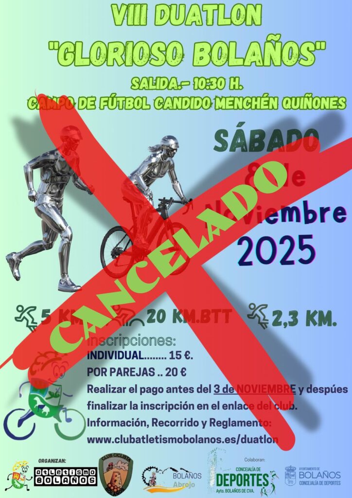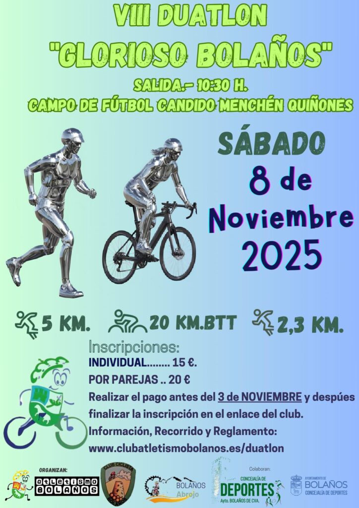 VIII DUATLON GLORIOSO VILLA DE BOLANOS REGLAMENTO Un año más, el Club Atletismo Bolaños volverá a celebrar el Duatlón Glorioso Villa de Bolaños.El número de participantes queda limitado a 80, por riguroso orden de entrega de inscripción.Contará con 2 categorías:- Individual. (Femenina y Masculina).- Por Parejas (Femenina, Masculina y Mixta). El formulario debe realizarse previo pago de la inscripción, que se hará en el siguiente número de cuenta (Santander):ES46 0049 6366 3424 1000 4454En el formulario se tendrá que adjuntar el justificaste de pago. Formulario de Inscripción Conoce el Recorrido y las Instalaciones Instalaciones1er Tramo CorriendoTramo en Bici2º Tramo CorriendoZona de Transición Anterior Siguiente Nuestros Colaboradores CLASIFICACIÓN INDIVIDUAL Posición Atleta Club 1ª Transición 2ª Transición 3ª Transición Tiempo Total CLASIFICACIÓN PAREJAS HOMBRES Posición Atletas Club 1ª Transición 2ª Transición 3ª Transición Tiempo Total CLASIFICACIÓN PAREJAS MIXTO Posición Atletas Club 1ª Transición 2ª Transición 3ª Transición Tiempo Total FOTOS FOTOS PODIUM